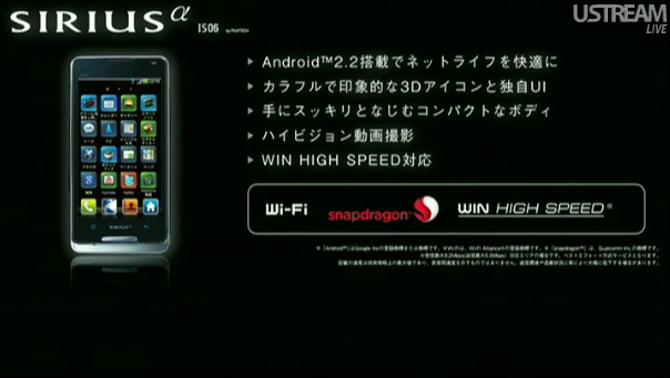 SIRIUSαはIS03、IS04、IS05とは異なり海外メーカー製端末になる。そのため、ワンセグ、おサイフケータイ、赤外線通信には非対応。一方、搭載OSは最新のAndroid 2.2で、Flash Player 10.1にも対応する。ディスプレイサイズは3.7インチ液晶で、解像度は480×800。この端末はIS series特有のOcean Observation UIを採用せず、独自のUIを備える。基本的にはIS03~IS05までのモデルと比べると、海外メーカー製のグローバルモデルそのままに近い端末になる。