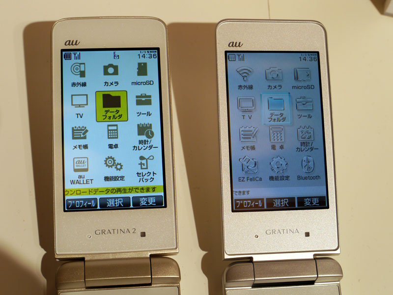 | 左がGRATINA2で右がGRATINA。「au WALLET」と「セレクトパック」がメニューに追加されている。 |
